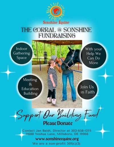 Please consider giving to Sonshine Equine's expansion by building the Corral, an indoor, year round gathering space.